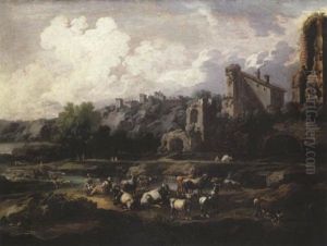 An Italian River Landscape With Drovers And Their Animals, A Town Beyond