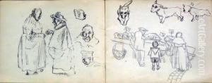 Jeunes Filles Lisant Crayon Sur Papier Etude Pour Le Tableau Du Musee De Grasse. 24.70 X 32.50 Cm