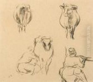 Quatre Etudes ; Deux Croquis D'une Femme Trayant Une Vache Et Deux Etudes De Vaches De Face Et De Fesse