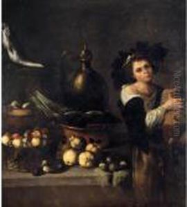 A Kitchen Still Life With A Servant Boy Holding A Cask Of Wine Beside A Table Laden With Fruit, Vegetables And Fish