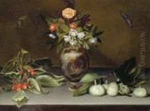 Narcissi And A Carnation In An Urn On A Stone Ledge With Cherries, Figs And Butterflies