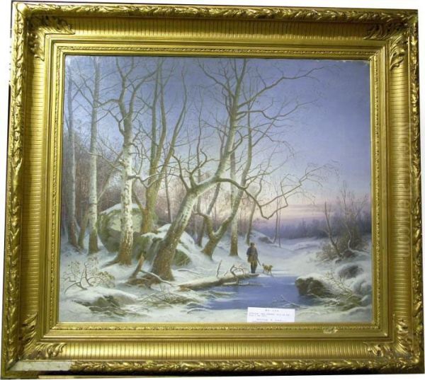 Vinterlandskap Med Jagare Och Hund.