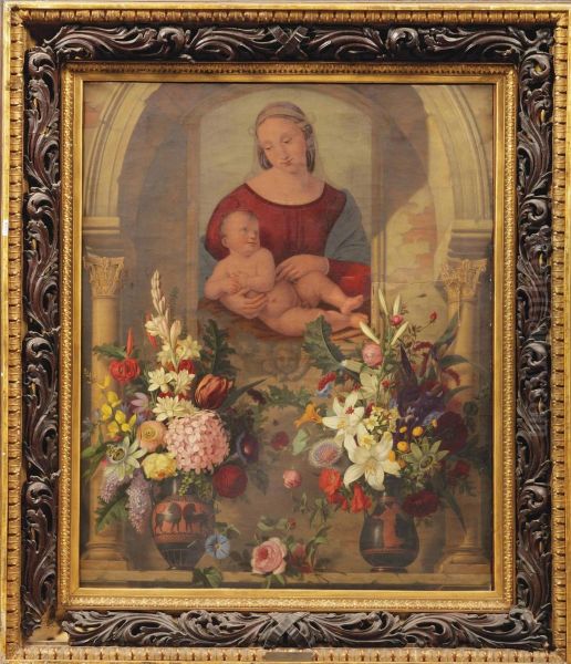 An Altar With Two Bouquets In Ancient Greek Vases Before A Painting Of Madonna And Child