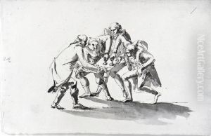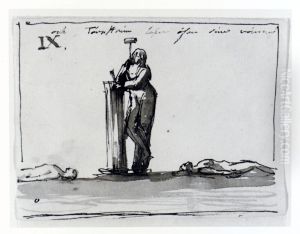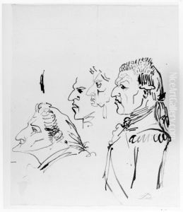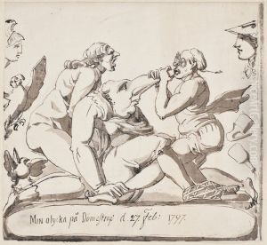 Karikatyrer och allegori. Tre man, Sergel i djurskepnad till vanster