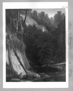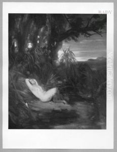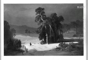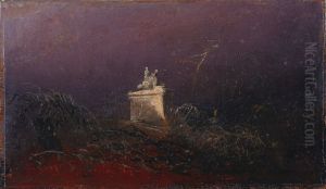 Blick durch einen Rundbogen auf eine Ruine in Abendbeleuchtung (Morgendammerung-Ruine) (Romantische Landschaft mit Opernmotiven)