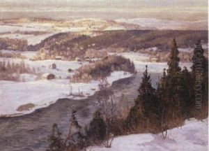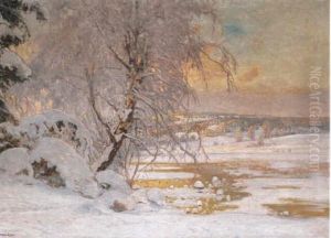 Vinterlandskap Med Sn"tyngda Tr,d Vid Vattendrag