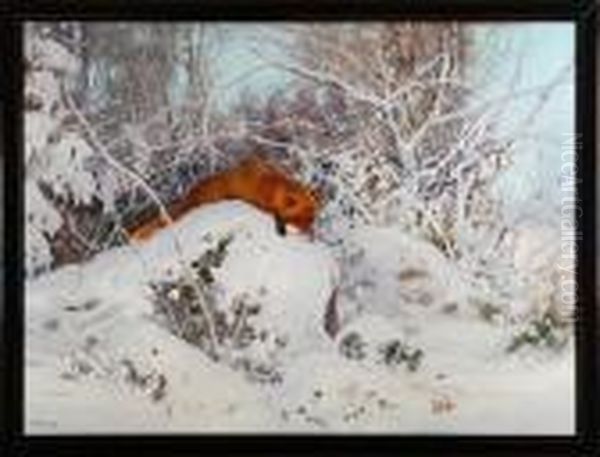 A Winter Scenery With A Fox. Signed