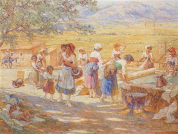 Washing Laundry On A Summer's Day Oil Painting by Carl Budtz-Moller