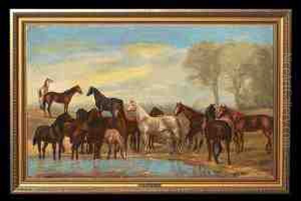 Heste Ved Et Vandingssted, I Baggrunden Frederiksborg Slot