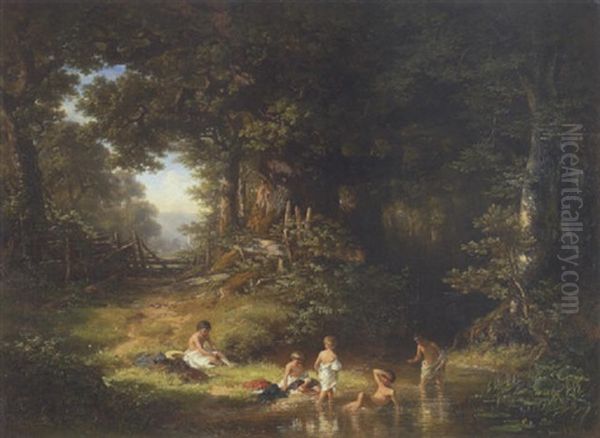 Waldlandschaft Mit Badenden Kindern Am Wasser