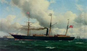 Marine Med Dampskib Taet Pa Kysten Og Sejlskibe I Horisonten