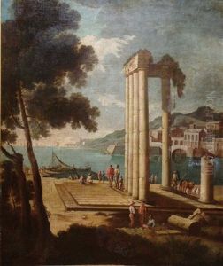 Ancient columns, Italy. In the background figures at the well. Pres. from Capri.