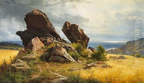 Klipper I En Bygmark. Optraekkende Bygevejr. Motiv Fra Allinge Paa Bornholm