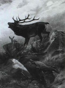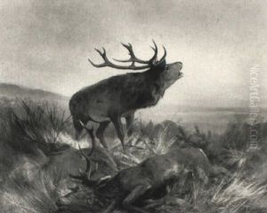 Rohrender Hirsch Mit Rudel In Hugelland