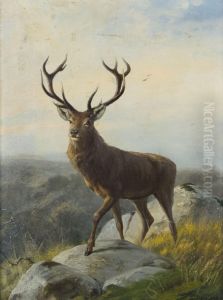 Hirsch Mit Hirschkuhen Auf Felsiger Anhohe