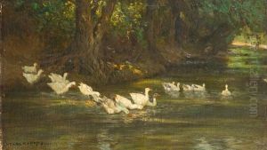 Impression Aus Ungarn. Flusufer Mit Gansen Unf Pflugenden Bauern