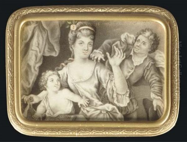 A Young Lady With Pink Rose And Band In Her Long Hair, Seated Holding A Musical Score With A Child With Loose Robes, A Gentleman Holding A Hat In His Left Hand Reaching For The Lady's Shoulder