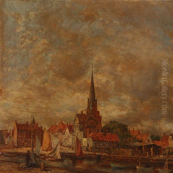 Harbour Scene With Houses And A Church, Presumably From Elsinore