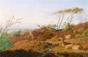 Kronhjort Med Sin Rudel I Lyngklaedt Landskab, I Baggrunden Oresund