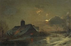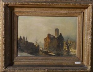 Abendliche Winterlandschaft Mit Einem Kastell An Einem Zugefrorenen Fluss