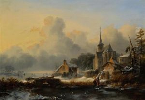 Hollandische Winterlandschaft Mit Schlittschuhlaufern Auf Einem Zugefrorenen Flus