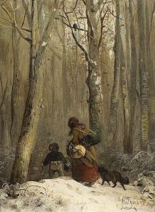 Im Winterwald. Drei Kinder Beim Reisigsammeln Unter Einer Grosen Eiche