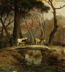Abendliche Waldlandschaft Mit Heimkehrendem Vieh