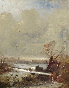 Abendliche Winterlandschaft Mit Einem Kastell An Einem Zugefrorenen Fluss. Signiert Und Datiert