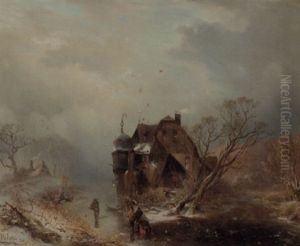Winterlandschaft Mit Zwei Jagern Vor Einem Wasserschlos