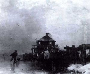 A Frozen Waterway With Skaters And A Horse-drawn Sledge By A Koek En Zopie Stand