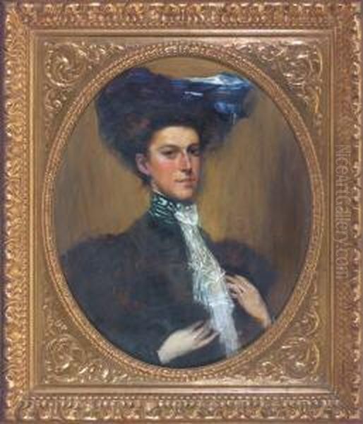 Brustbild Einer Jungen Dame Im Schwarzen Kleid Mit Ausladendem Schwarzen Hut, Halb Nach Rechts