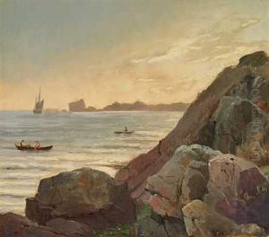 Kystparti Med Sejlskibe Ud For Mindre Fyr