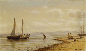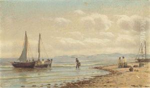 Fiskere Ved Deres Bade Pa Skagen Strand, I Baggrunden Lyser Det Gra Fyr