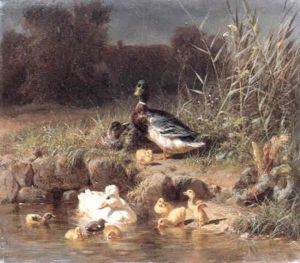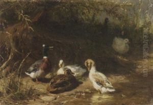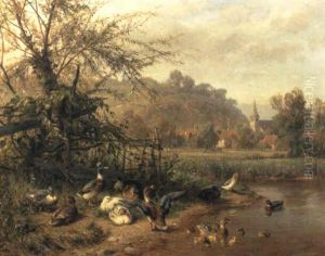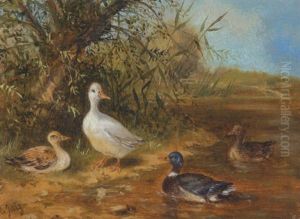 Enten An Einem Teich. Im Hintergrund Bauernhaus Hinter Baumen