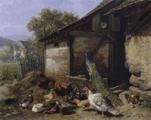 Der Huhnerhof. Auf Und Vor Einem Misthaufen Huhner, Enten, Ein Pfau Und Ein Truthahn