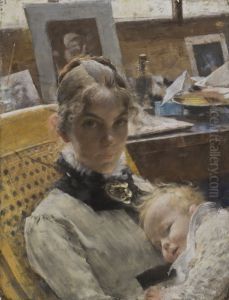Atelje-idyll. Konstnarens hustru med dottern Suzanne