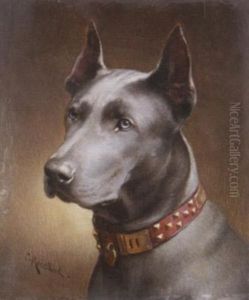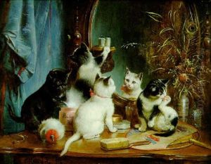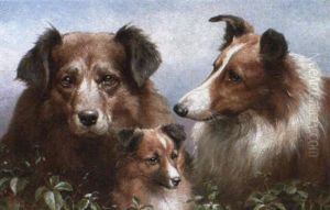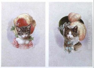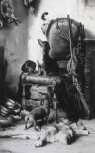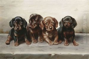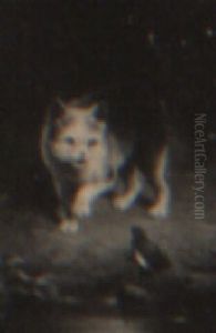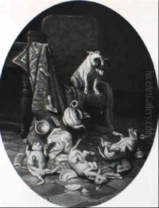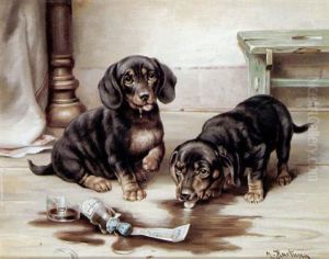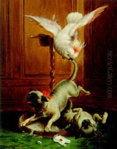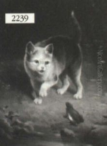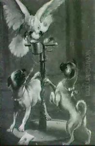 Zwei Junge Hunde, Mit Einer Katze Zankend