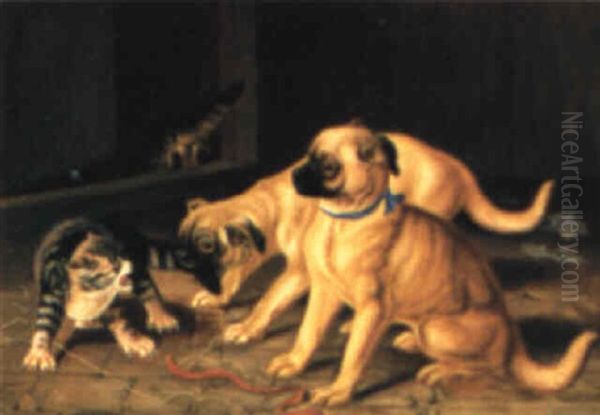 Zwei Junge Hunde, Mit Einer Katze Zankend