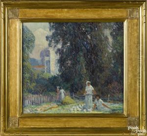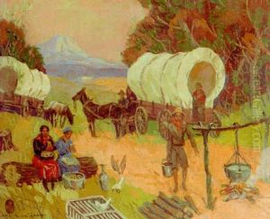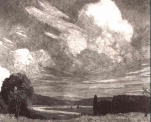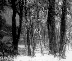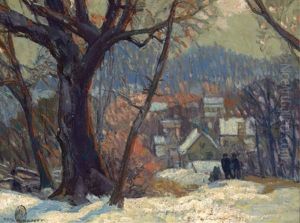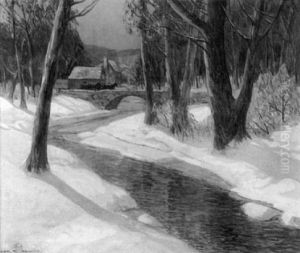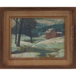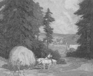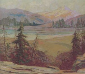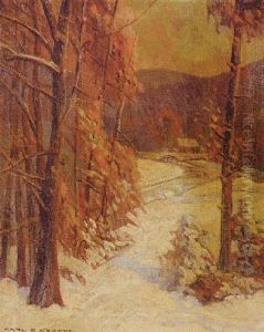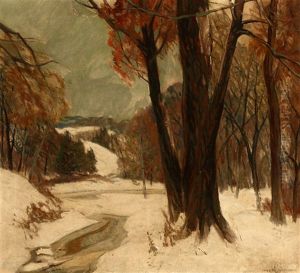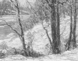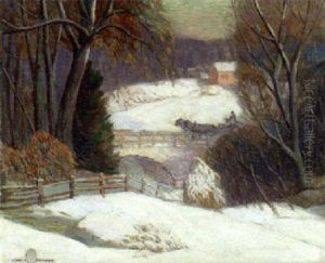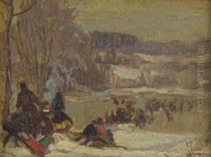 Winter Landscape With Figures Riding In A Horse-drawn Sleigh Flanked By Dense Forest And Mountains