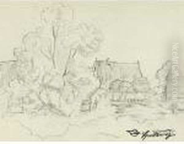Skizze Einer Dorflichen Idylle Mit Hinter Hohenbaumen Verborgenem Haus Am See