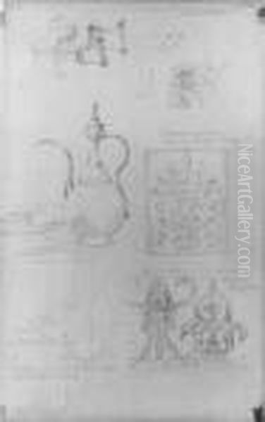 Studienblatt Mit Turkischen Waffen, Einer Kanne Und Ornamentalen Schnitzereien (doppelseitig). Mit Notizen Von Der Hand Spitzwegs.