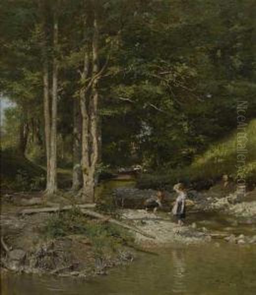 Spielende Kinder Am Waldbach.
