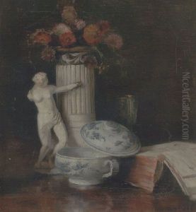 Opstilling Med Lagskal, Bog, Statuette Samt Piedestal Hvorpa Violette Blomster