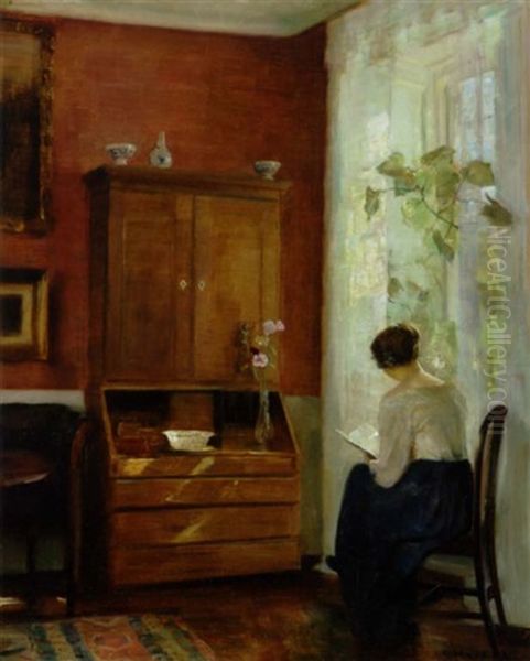 Interior Med Laesende Kvinde Ved Vinduet