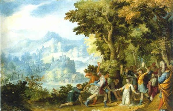 An Extensive Mountainous Wooded Landscape With The Stoning Of Saint Stephen