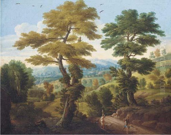 A Wooded Landscape With Travellers On A Path