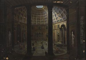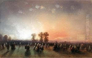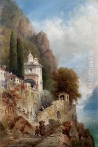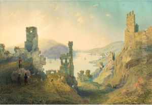 A Moonlit River, Oriental Buildings And Palm Trees, Two Travellersin The Foreground