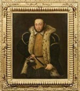 Portrait Of A Lady In A Gold And Silver Embroidered Dress And With A Plumed Headdress, Before A Red Curtain