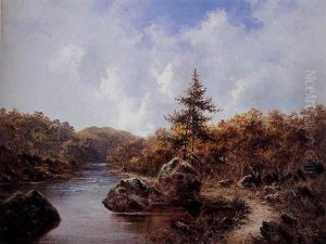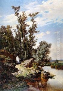Paysage De Campagne A La Riviere Avec Un Patre Et Son Troupeau