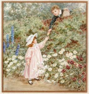 A Little Girl Carrying A Basket Of Flowers Before An Azaleabush